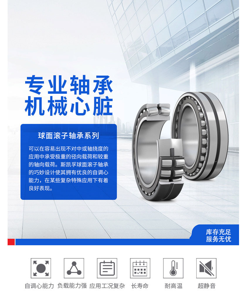 SKF球面滾子軸承的滾子的制造極為嚴(yán)格的公差尺寸和形式。每個(gè)輥?zhàn)釉诩现械钠渌伒某叽绾托螤顜缀跏窍嗤摹?yōu)化負(fù)荷分布輥軸承的使用壽命