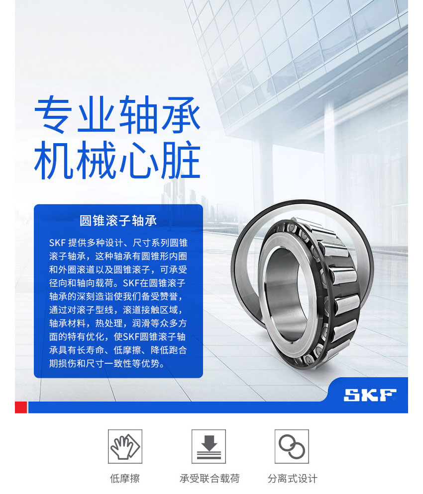 SKF圓錐滾子軸承,可以分離,由內(nèi)圈與滾子、保持架一起組成的組件和外圈可以分別安裝。