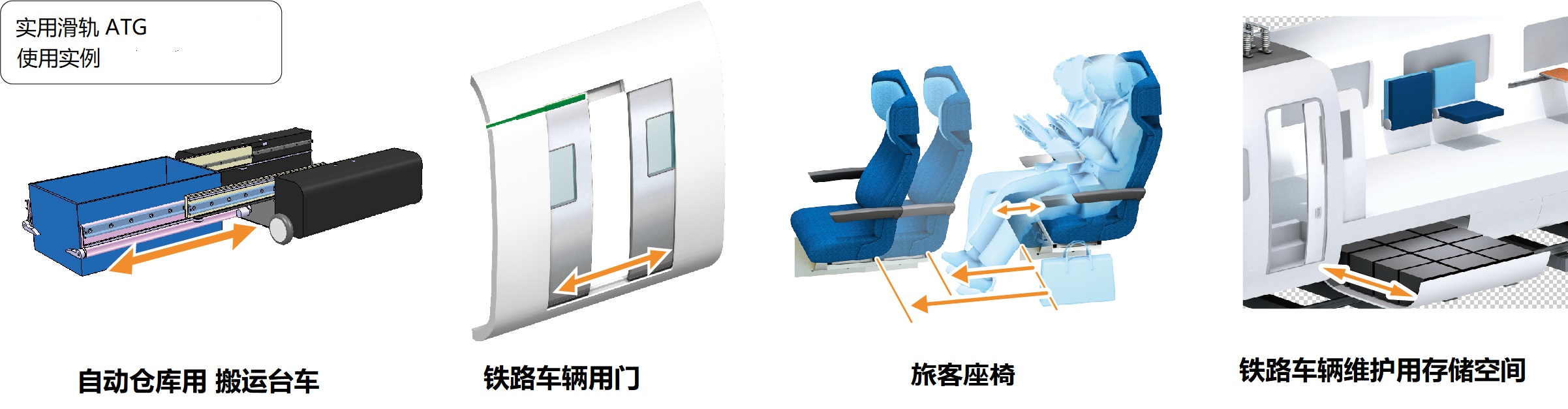 “ATG”通過(guò)實(shí)現(xiàn)高負(fù)荷容量和耐久性,旨在向需要實(shí)用級(jí)別的物流和鐵路領(lǐng)域推廣,特別是在自動(dòng)倉(cāng)庫(kù)的搬運(yùn)臺(tái)車(chē)的取出部分,鐵路車(chē)輛門(mén)的打開(kāi)和關(guān)閉部分,飛機(jī)座椅的滑動(dòng)機(jī)構(gòu)等都有很大的使用前景。